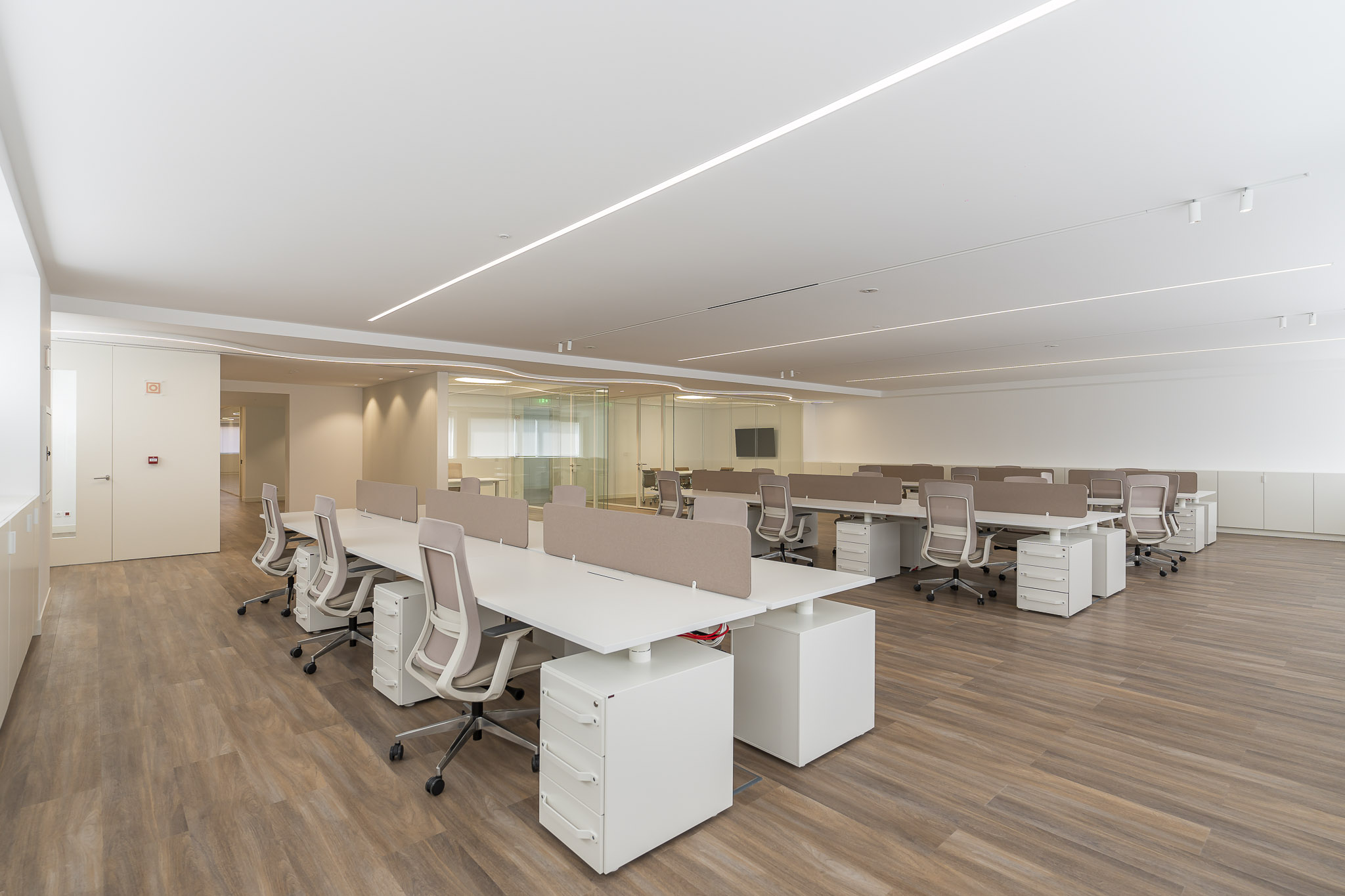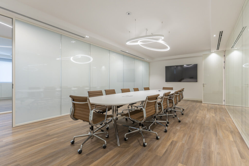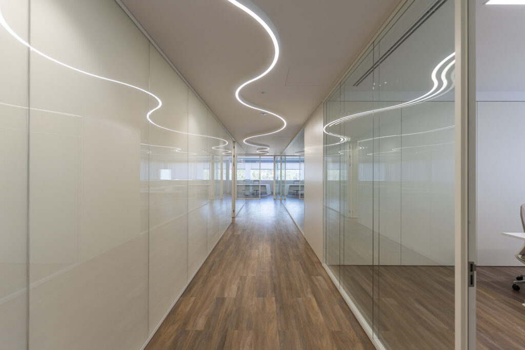 A Maqtrends realizou a remodelação completa dos escritórios da Rodi Industries, criando um espaço moderno, funcional e orientado para a produtividade. O projeto integrou áreas distintas, incluindo salas de reunião equipadas com tecnologia audiovisual, zonas de trabalho open space e áreas de apoio, como copa e espaços de circulação. A utilização de divisórias envidraçadas garante luminosidade natural e transparência, enquanto o pavimento vinílico de alta resistência proporciona conforto e durabilidade. A iluminação foi cuidadosamente planeada, combinando soluções embutidas e decorativas para assegurar eficiência energética e um ambiente elegante.